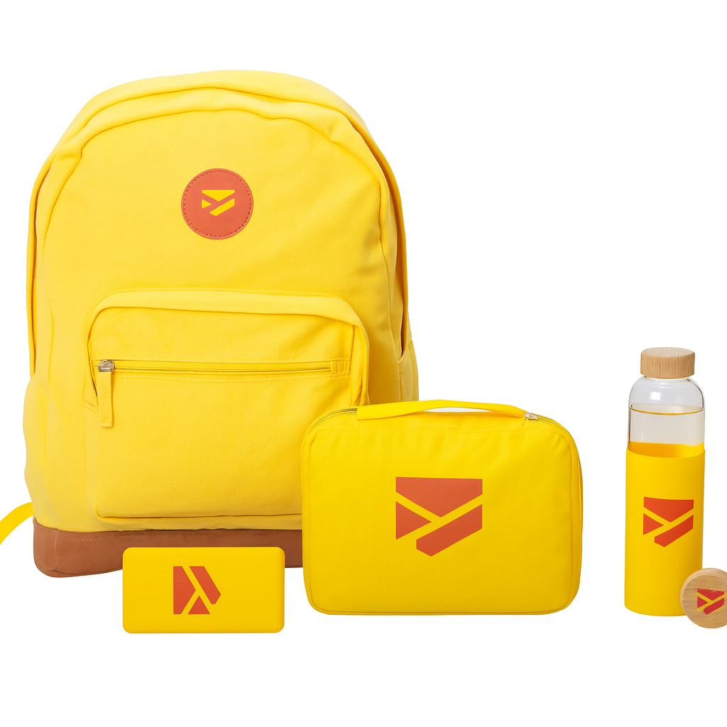 несессер- полиэстер, бутылка- стекло, силикон, бамбук, рюкзак- хлопок, полиэстер, аккумулятор- пластик с покрытием soft-touch