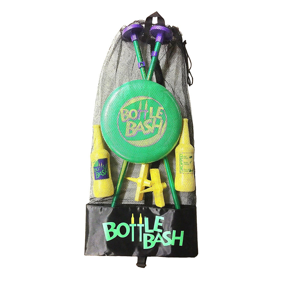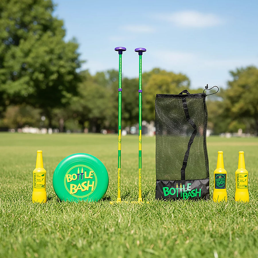 Набор включает игровые стойки, небьющиеся бутылки и мягкий диск. Конструкция подходит для игры на песке, газоне и твёрдых поверхностях, а компактный формат удобен для перевозки и хранения. Возможна персонализация: логотип или фирменные элементы можно разместить на бутылках, основании или упаковке.