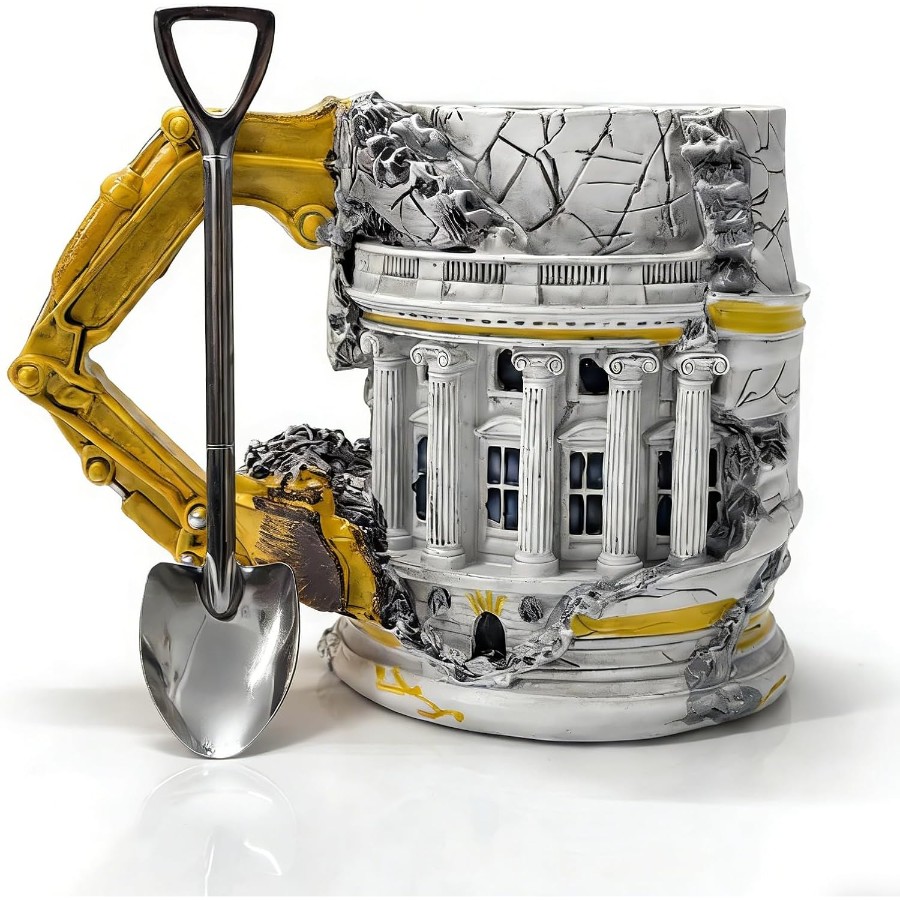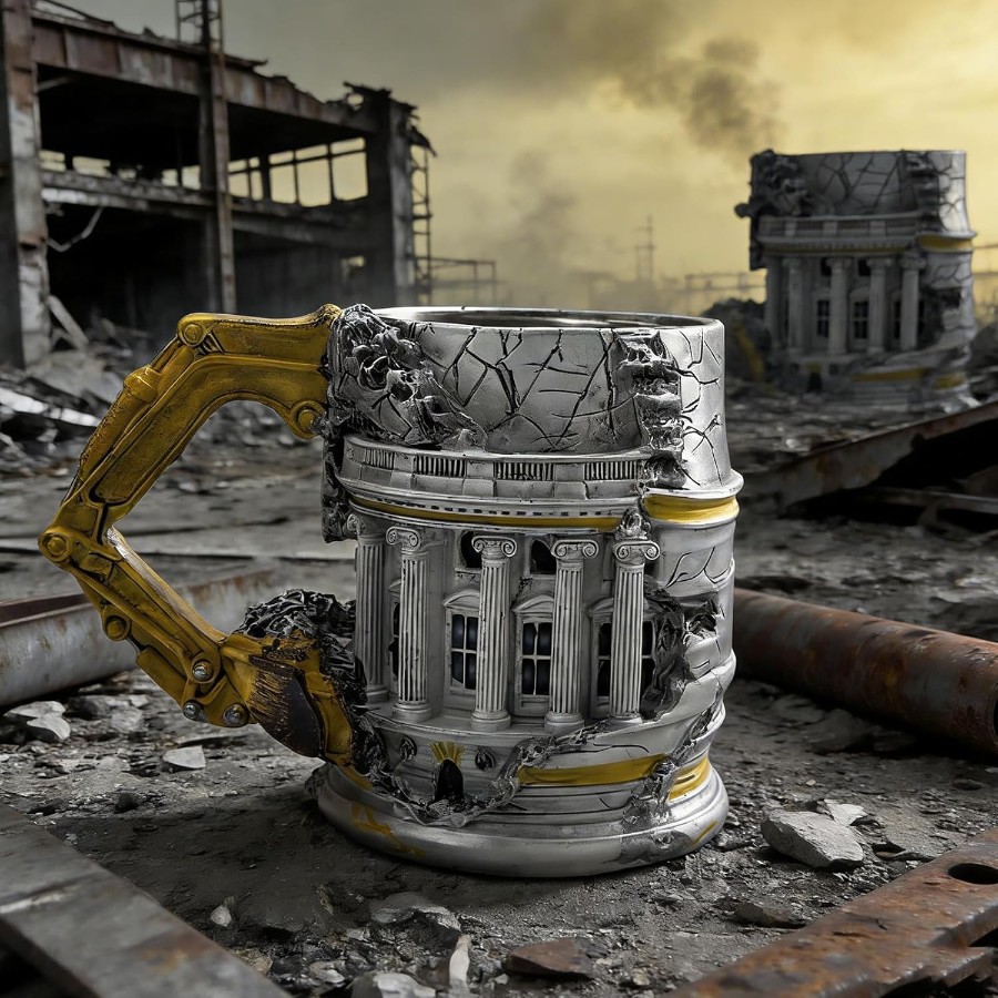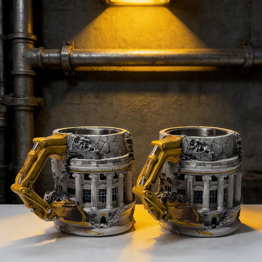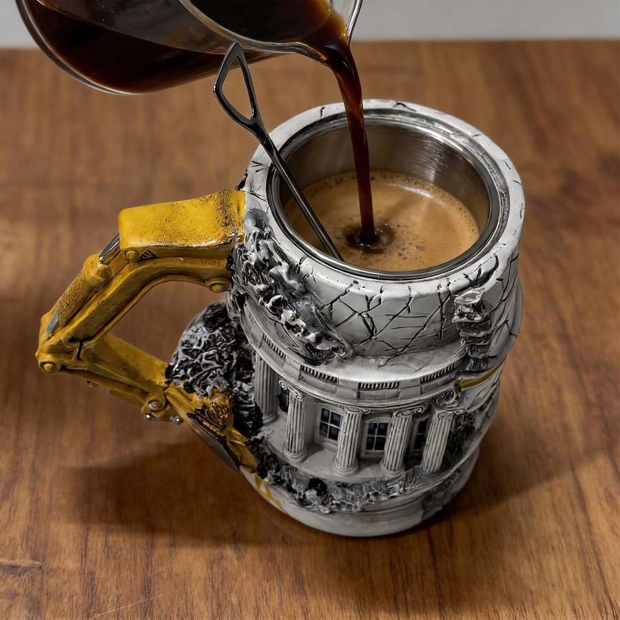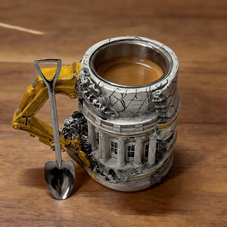 Кружка выполнена с 3D-ручкой в форме ковша экскаватора, что делает изделие визуально заметным и запоминающимся. Основа сочетает внешний корпус из прочной смолы и внутреннюю колбу из нержавеющей стали. Объём 300 мл подходит для повседневного использования. Возможна адаптация под корпоративные задачи: нанесение логотипа усиливает ассоциацию бренда с отраслью и формирует устойчивый визуальный контакт.