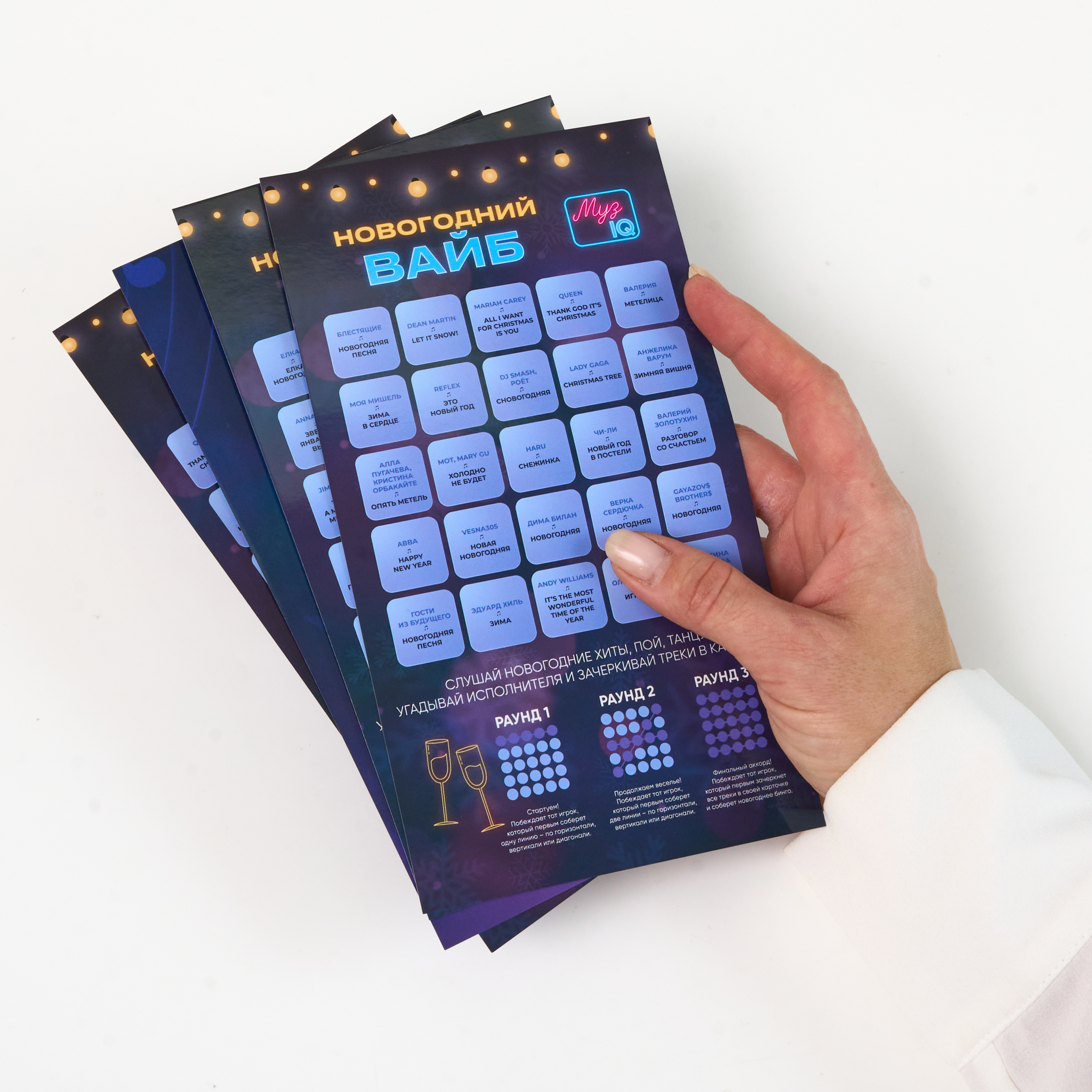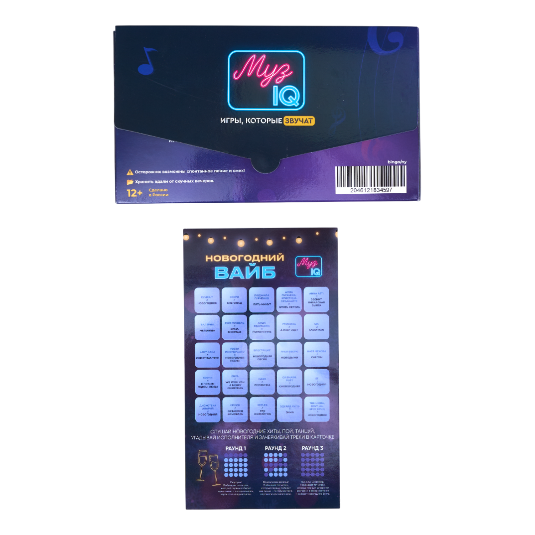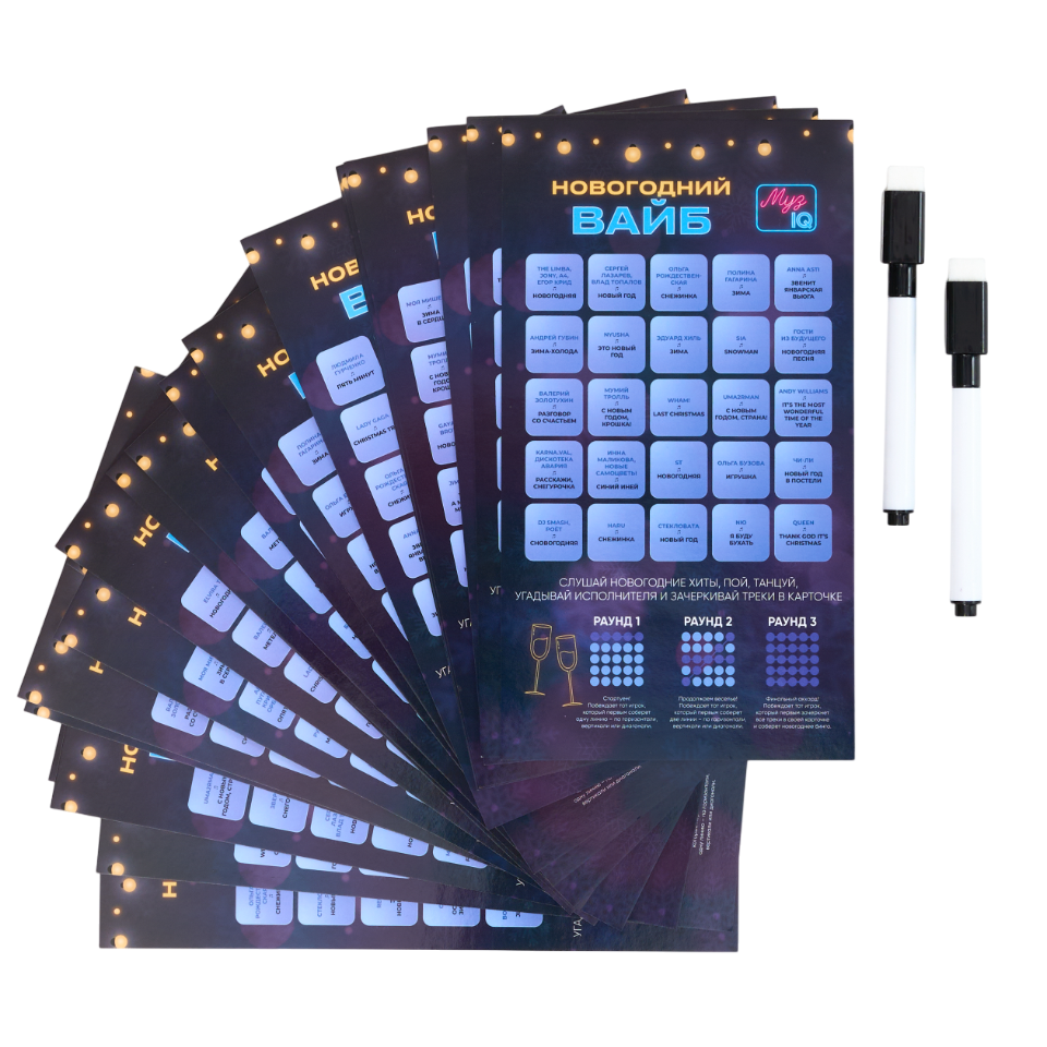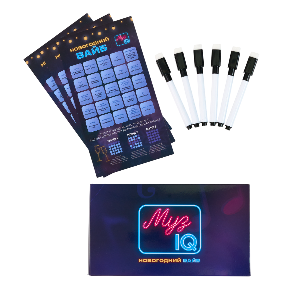 Откройте для себя «Музыкальное бинго МузIQ» – идеальную праздничную настольную игру, которая наполнит ваш вечер волшебством и любимой музыкой! Это современное музыкальное лото, где каждый участник погружается в атмосферу зимних праздников, слушая знаменитые новогодние и рождественские мелодии.