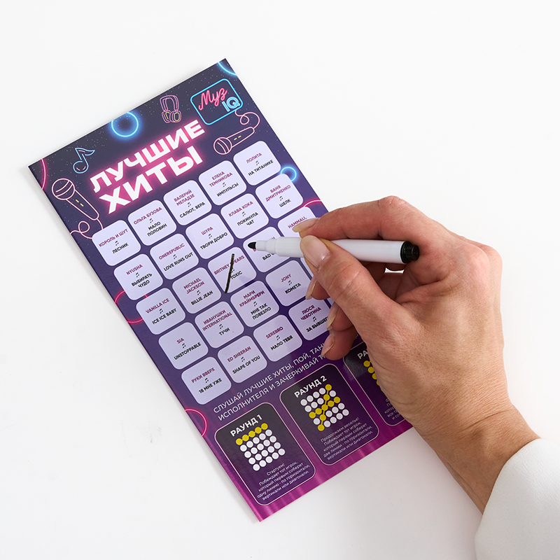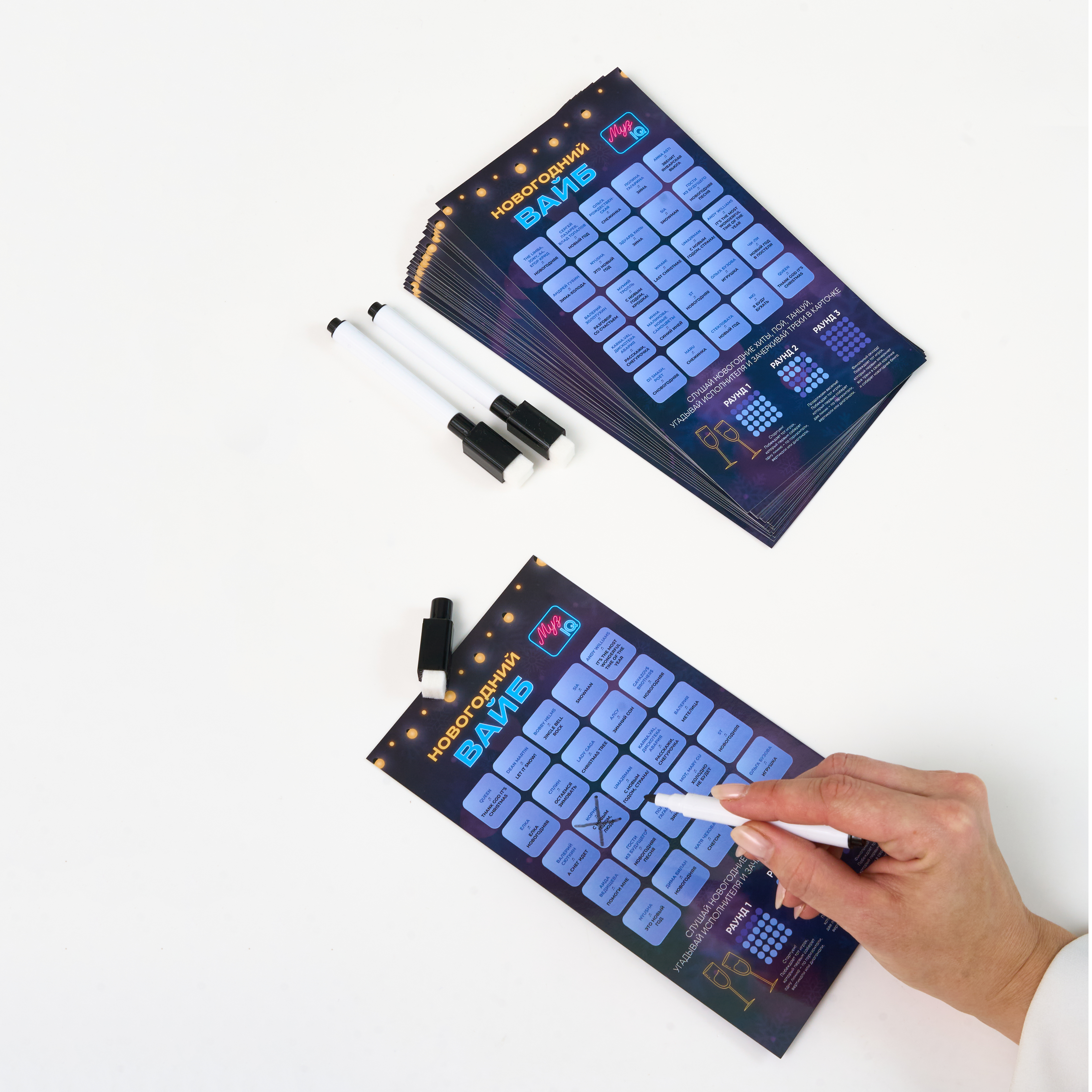Ваша задача – быть первым, кто отметит нужную комбинацию треков на своей карточке и громко крикнет «Бинго!». В специальном боте вас ждут 60 тщательно отобранных композиций: от вечной рождественской классики до современных праздничных хитов. В набор входит 24 многоразовые ламинированные карточки, 6 маркеров «пиши-стирай» и удобный конверт для хранения, гарантируя долгие часы веселья.