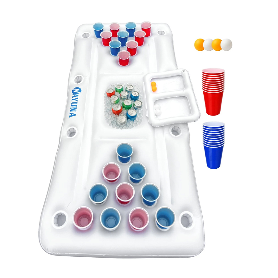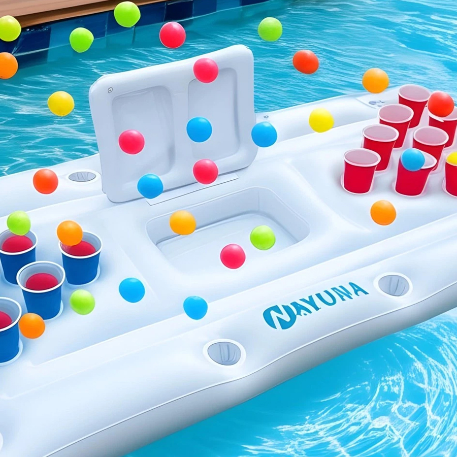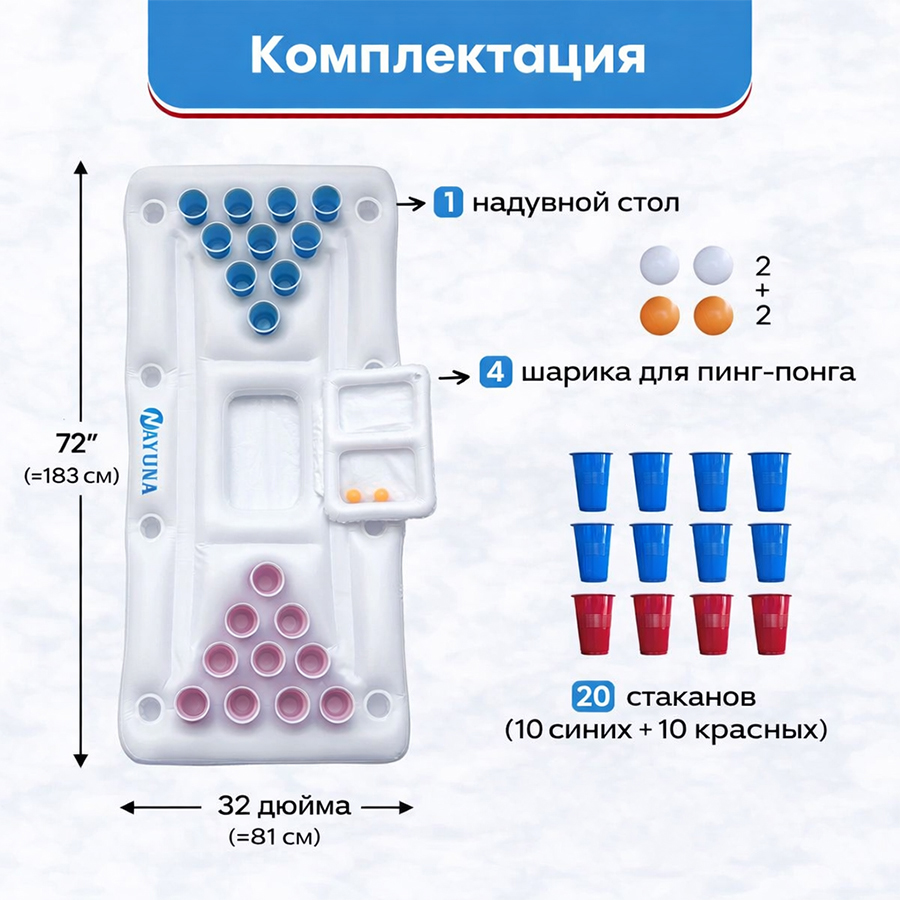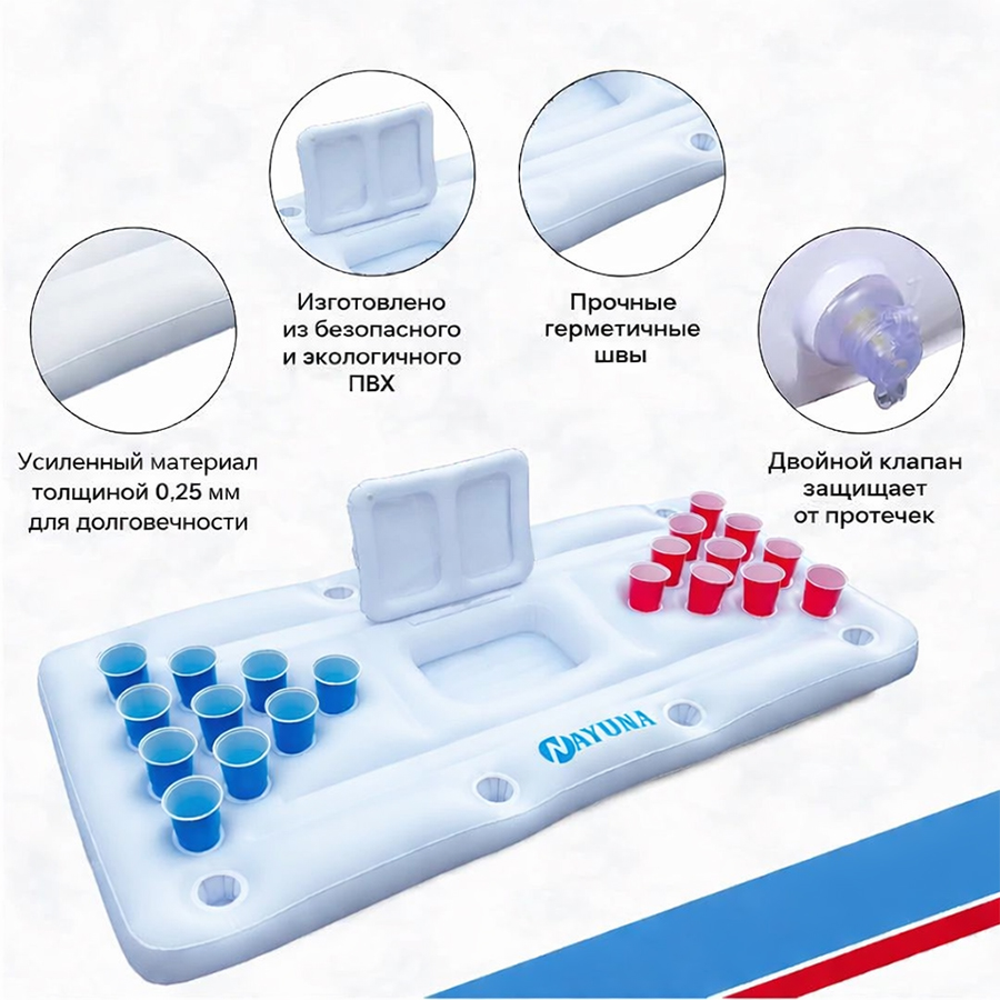 Модель оснащена встроенным охлаждающим отсеком для льда и напитков, а также отверстиями для стаканов, что делает её удобной для игр и общения. Изготовлена из прочного PVC-материала, устойчива к износу и рассчитана на многократное использование. В комплект входят столик, набор стаканов и мячи для игры в Пиво-понг. Возможна адаптация под корпоративные задачи: нанесение логотипа делает изделие заметным элементом мероприятий и промо-активностей.
