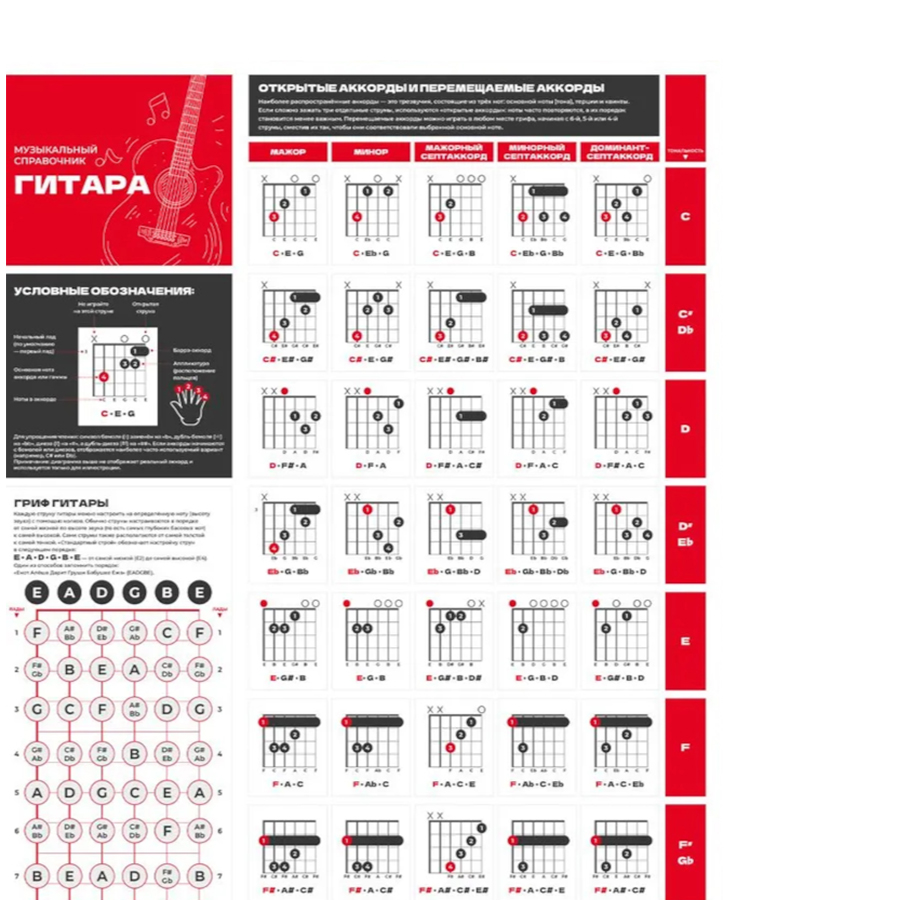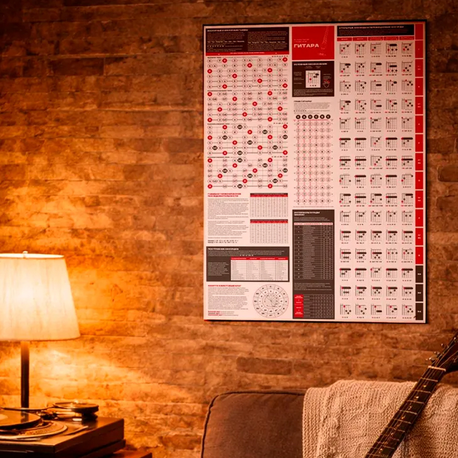 Обучающий настенный плакат «Теория и аккорды для гитары» — это наглядный справочник для быстрого ориентирования в аккордах, гаммах и нотах на грифе без постоянного поиска схем. Вся ключевая информация собрана на одном листе, что упрощает запоминание и практическое освоение теории. Крупный формат A1 подходит для дома, класса или студии.