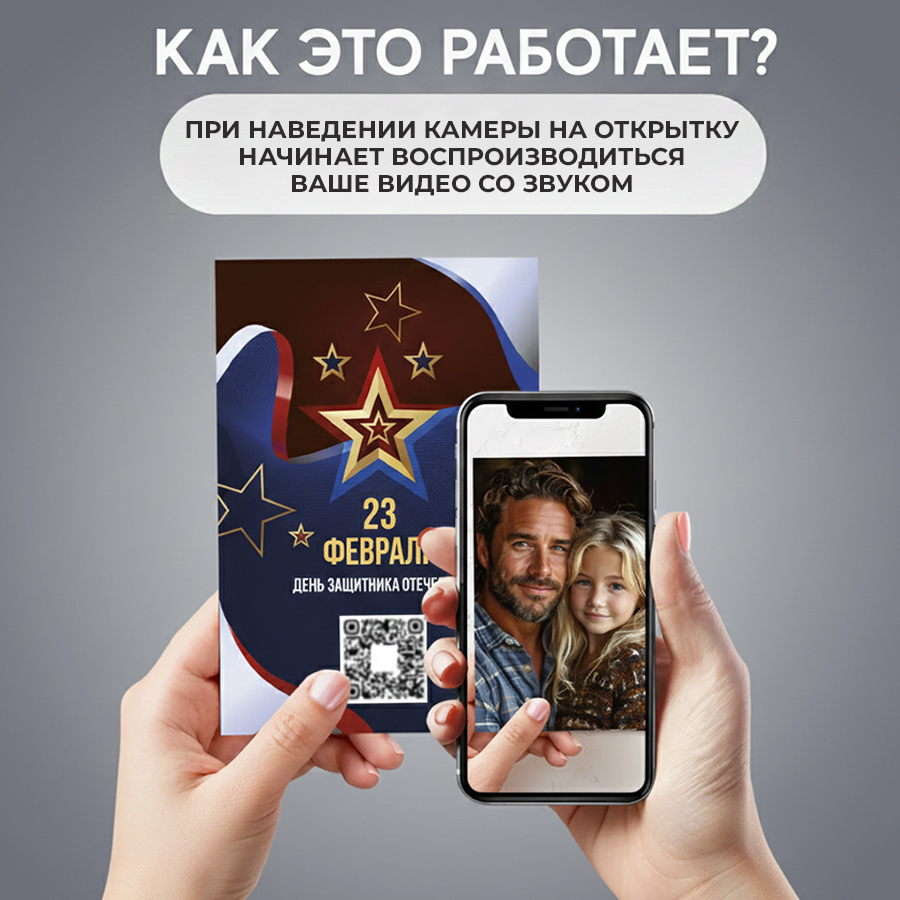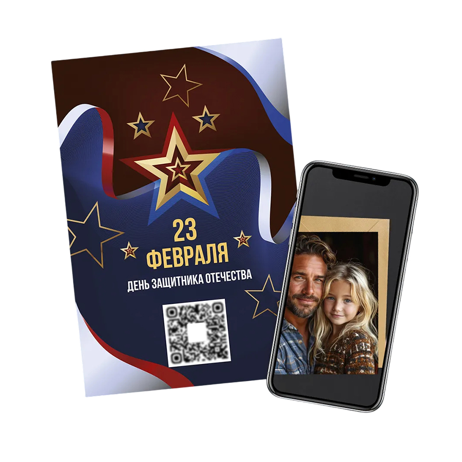 Оживающая открытка с вашим видео — уникальный подарок на 23 февраля. Загрузите видео-поздравление, и получатель увидит его через QR-код, испытав искренний восторг от сюрприза. Идеальный способ поздравить ярко и эмоционально. Ваши слова признания или тёплые воспоминания превратятся в ожившее мгновение, которое останется в памяти.