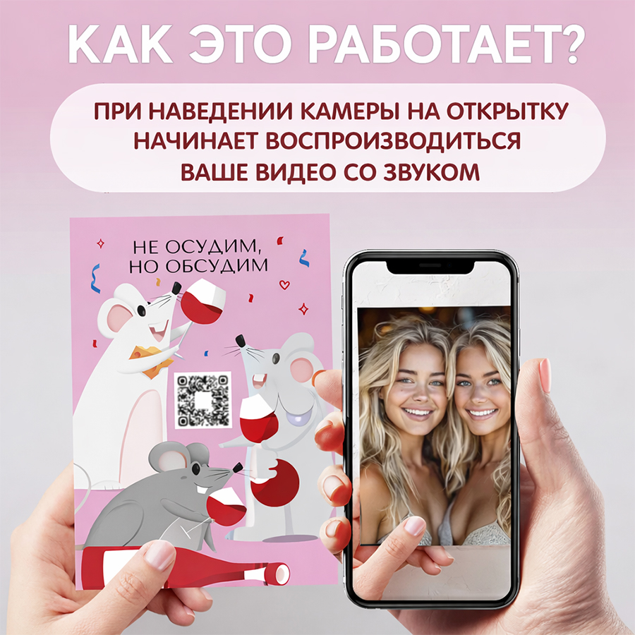 Оживающая открытка с вашим видео — это необычный способ поздравить и подарить эмоции. Достаточно загрузить видеопослание, а QR-код откроет его на смартфоне получателя. Открытка словно оживает, превращая тёплые слова, признания или воспоминания в личный и запоминающийся момент.
