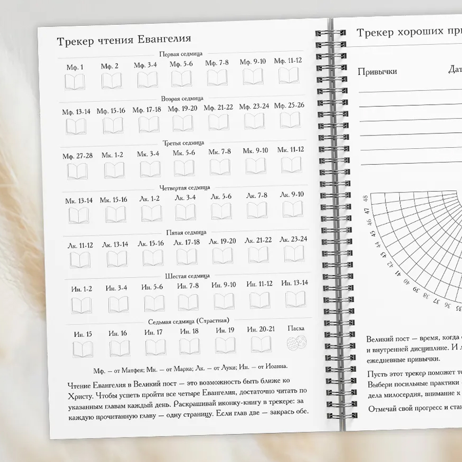 Внутри — трекер чтения Евангелия на весь пост, трекер полезных привычек на 48 дней, календарь богослужений и постного питания, страницы для размышлений до и после поста, ежедневное планирование с духовной целью дня, молитвами, заметками и благодарностью. Также предусмотрены чек-лист благих дел, страницы поминовения, пасхальная подготовка и листы для заметок.