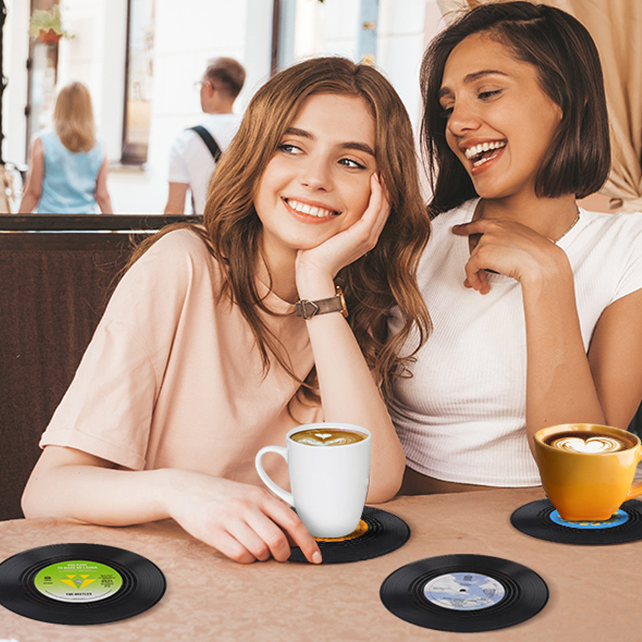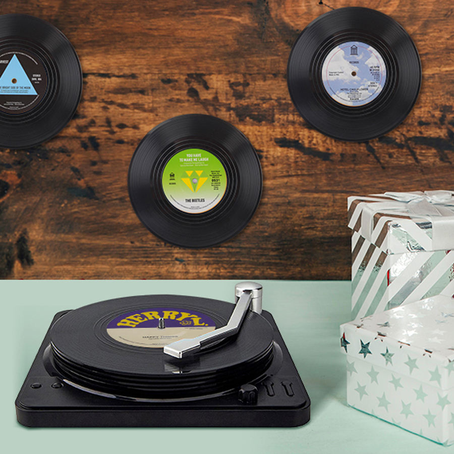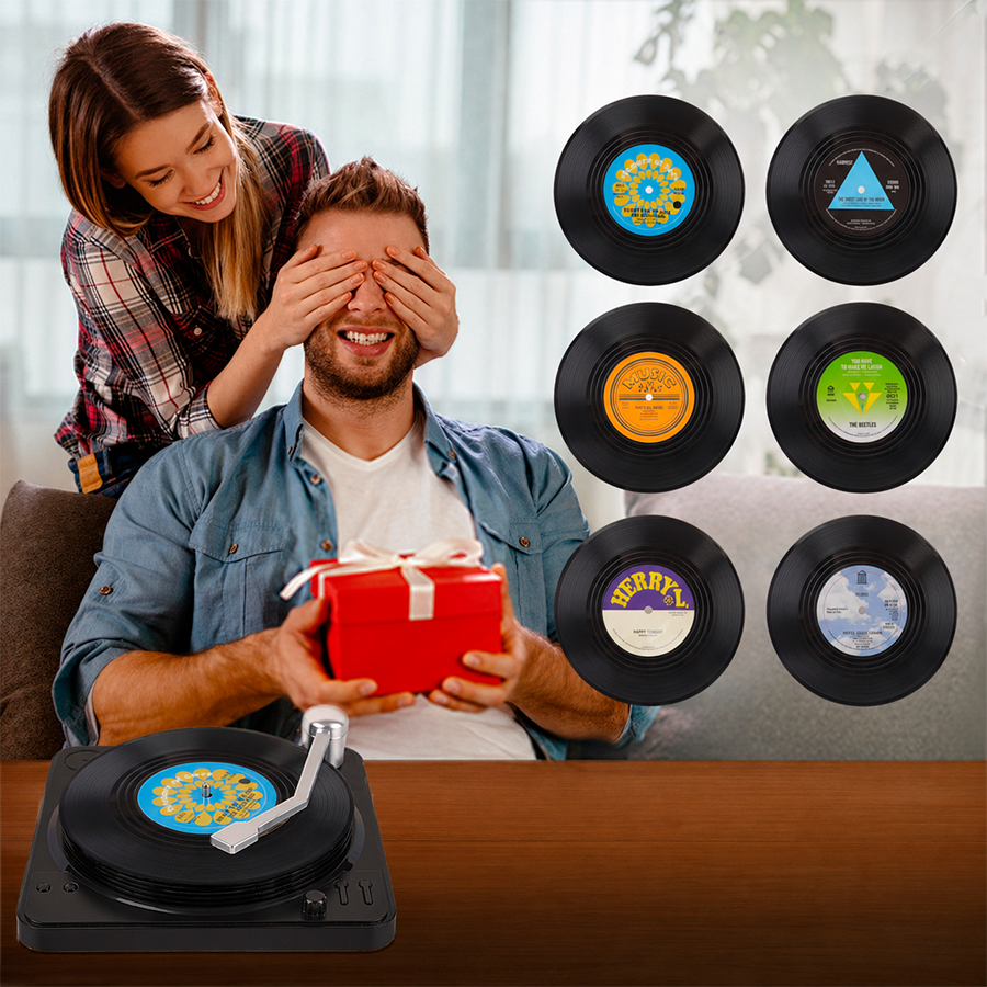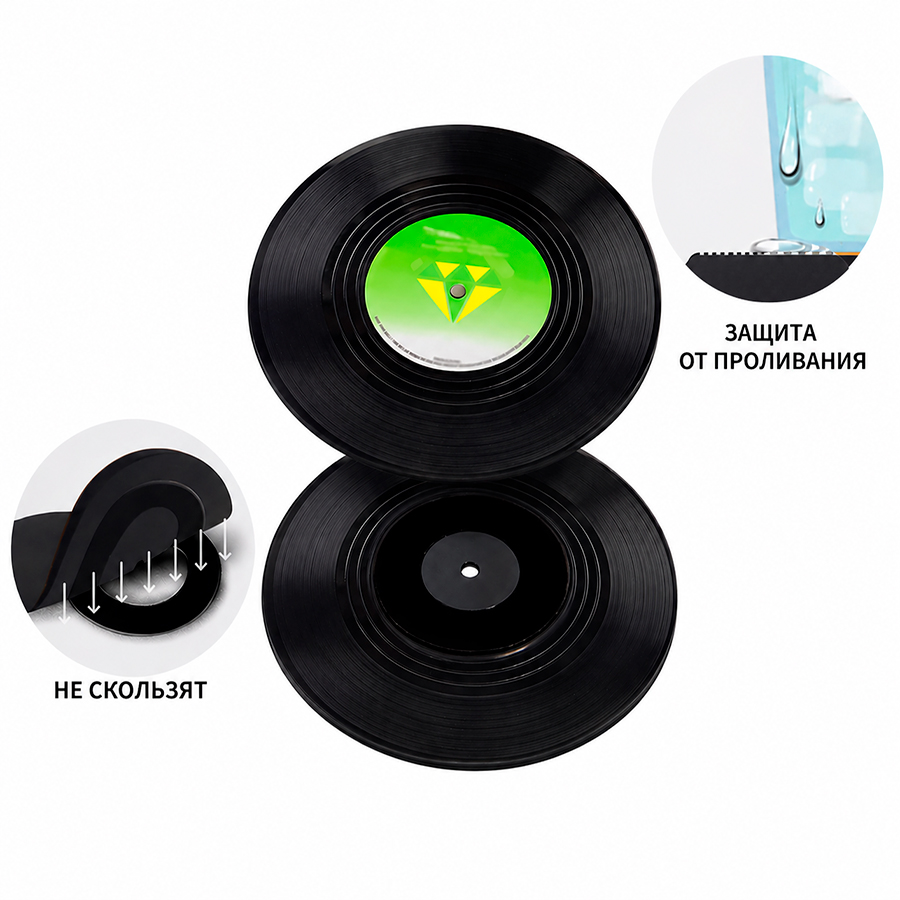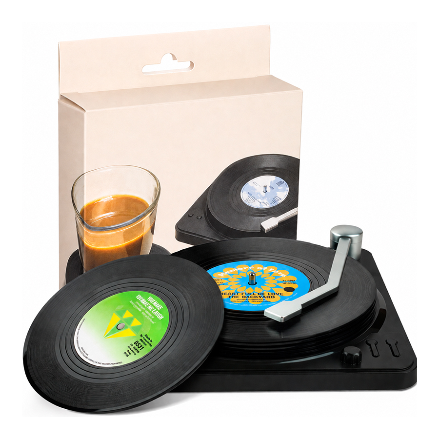 Набор включает 6 подставок, выполненных в стилистике ретро-винила, а также держатель в виде проигрывателя. Изделия защищают поверхность стола от влаги и температурных воздействий, а противоскользящая основа обеспечивает устойчивость. Компактный формат и выразительный дизайн делают набор заметным элементом интерьера. Возможна адаптация под корпоративные задачи: нанесение логотипа позволяет использовать изделие как брендированный сувенир.