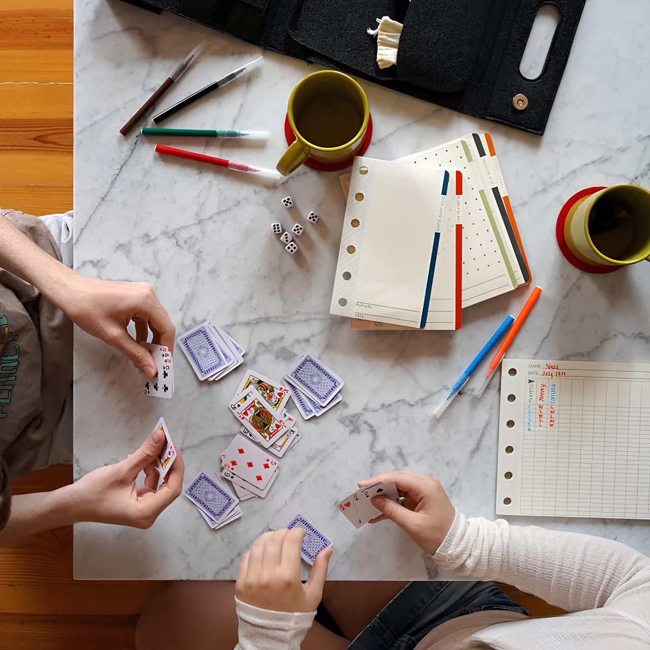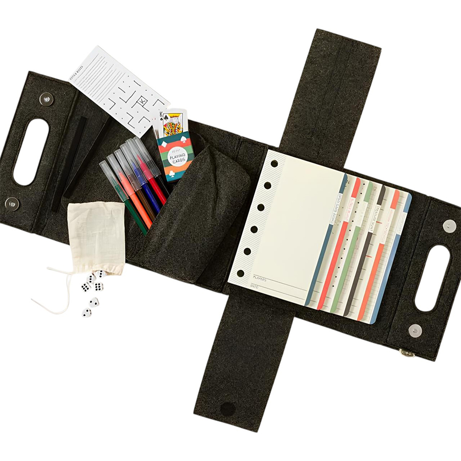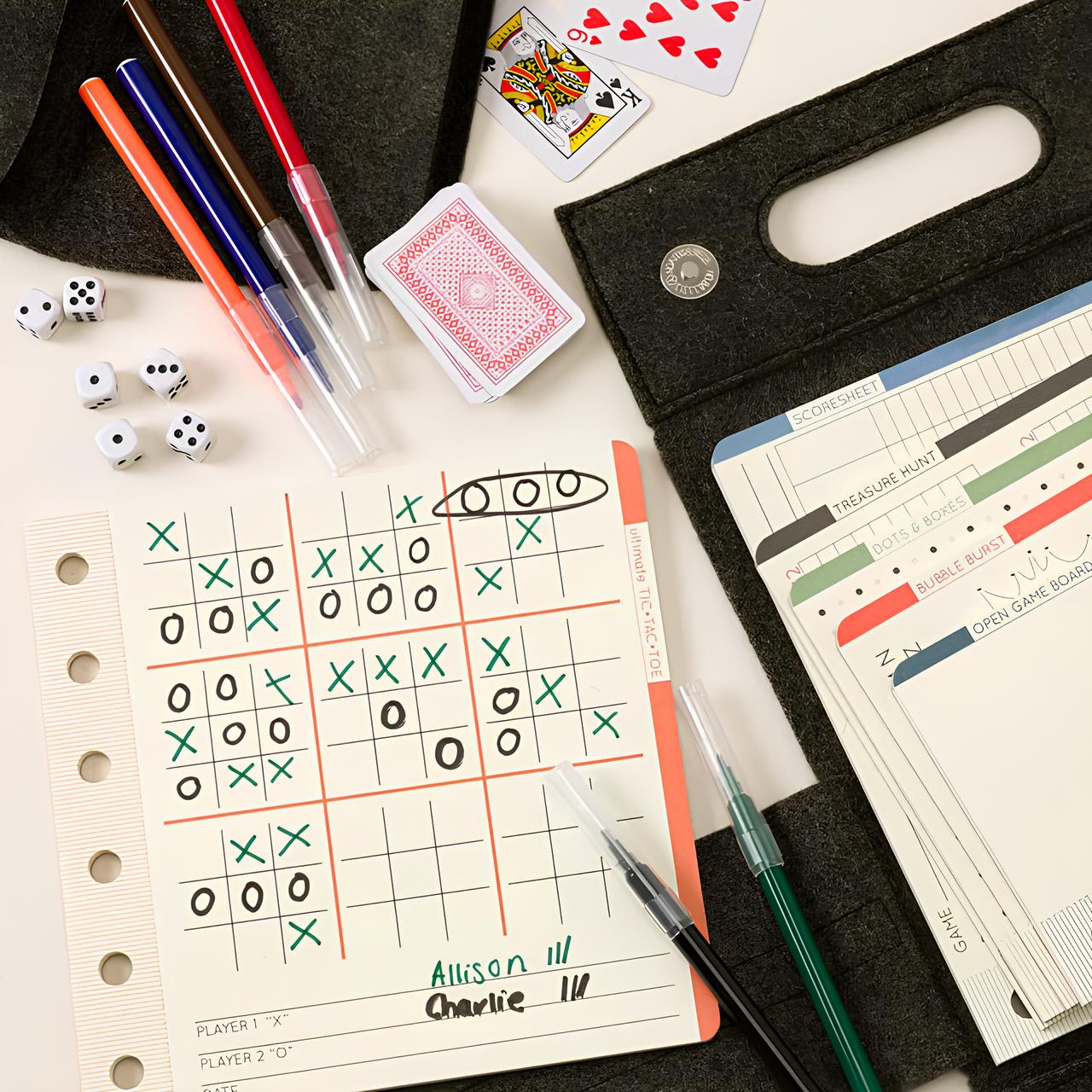 блокнот с играми, чистый блокнот, мини-колода карт, кости, маркеры, игровые сценарии, правила, складной дорожный кейс и отдельный мешок