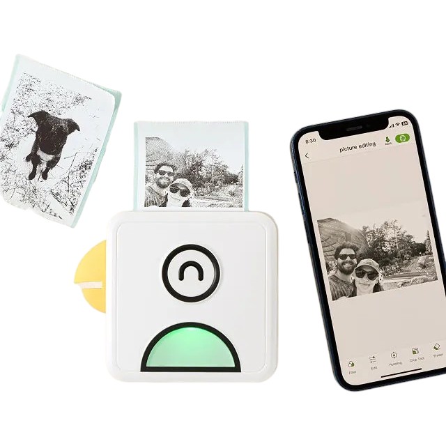 Принтер подключается через Bluetooth и позволяет редактировать изображения перед печатью с помощью мобильного приложения. Подходит для печати фотографий и быстрых наклеек. Возможна адаптация под корпоративные задачи: брендирование упаковки делает устройство функциональным и запоминающимся подарком.
