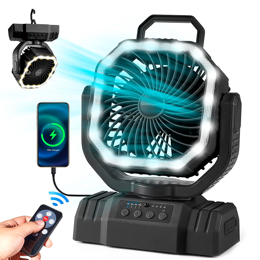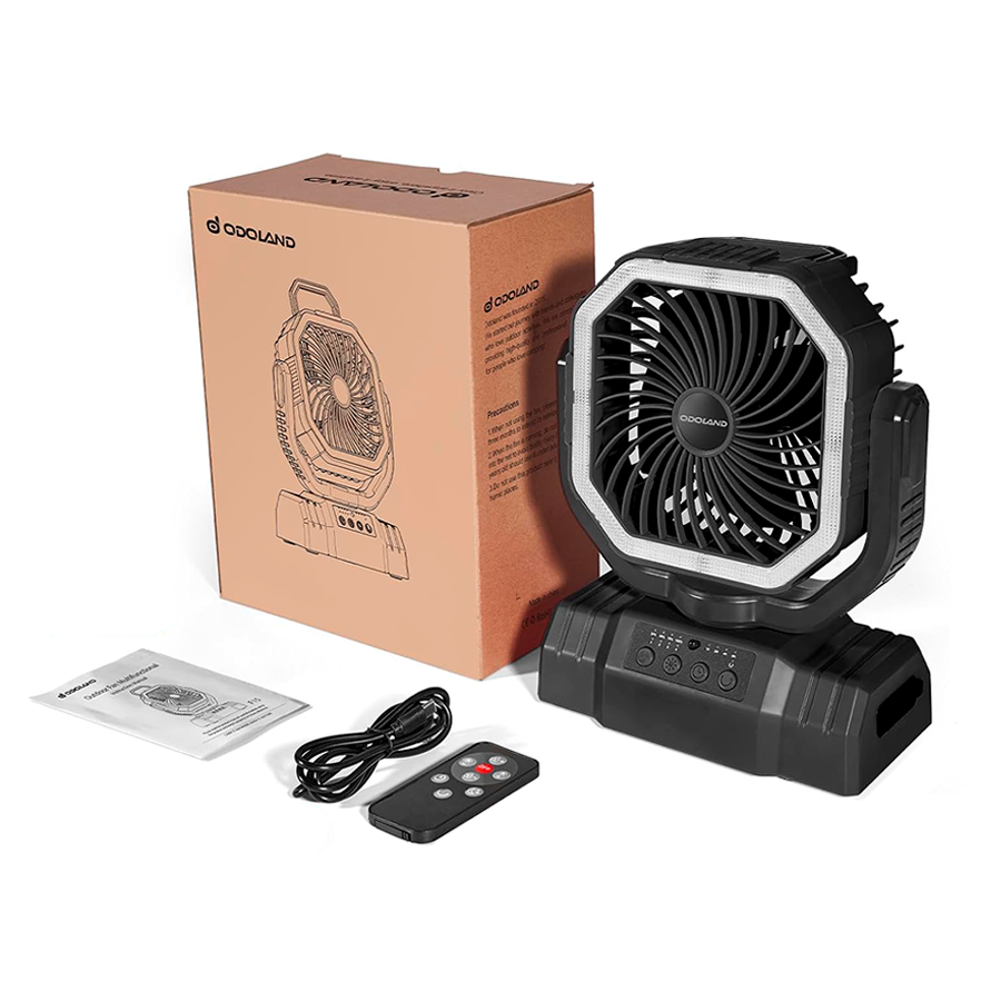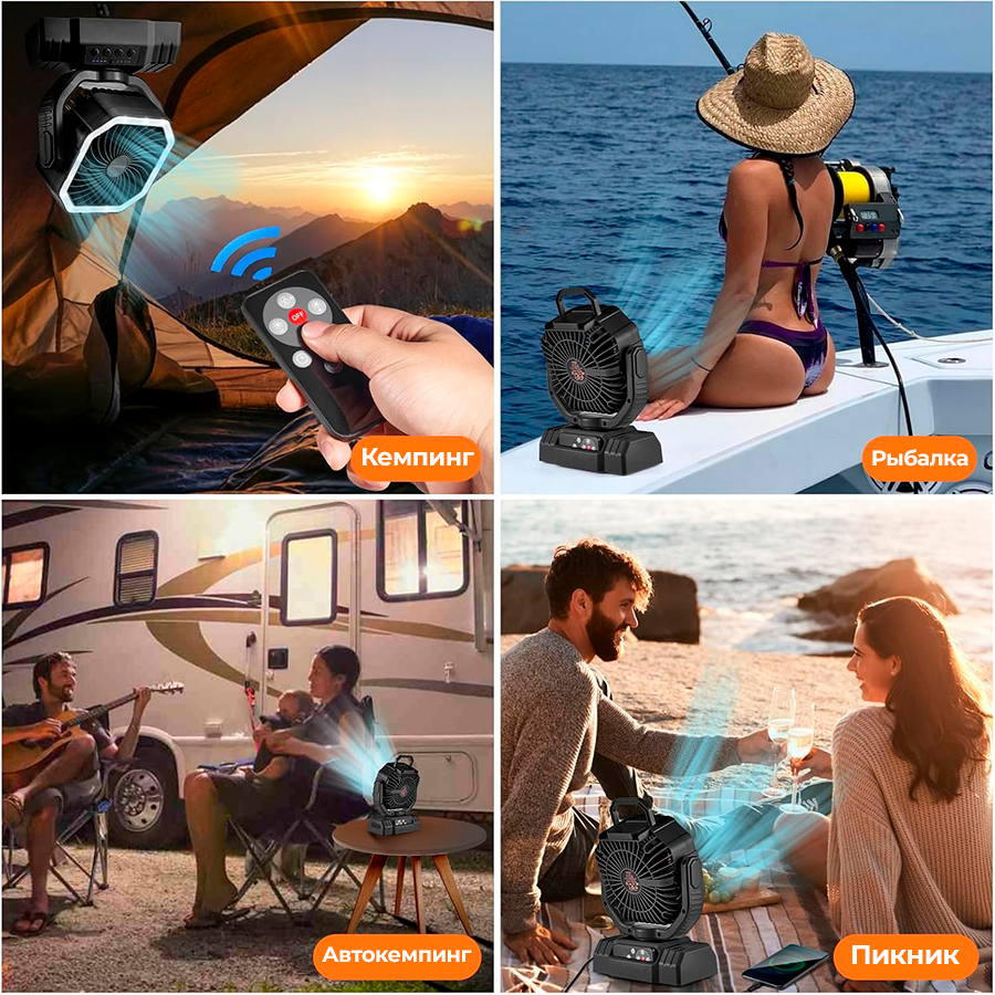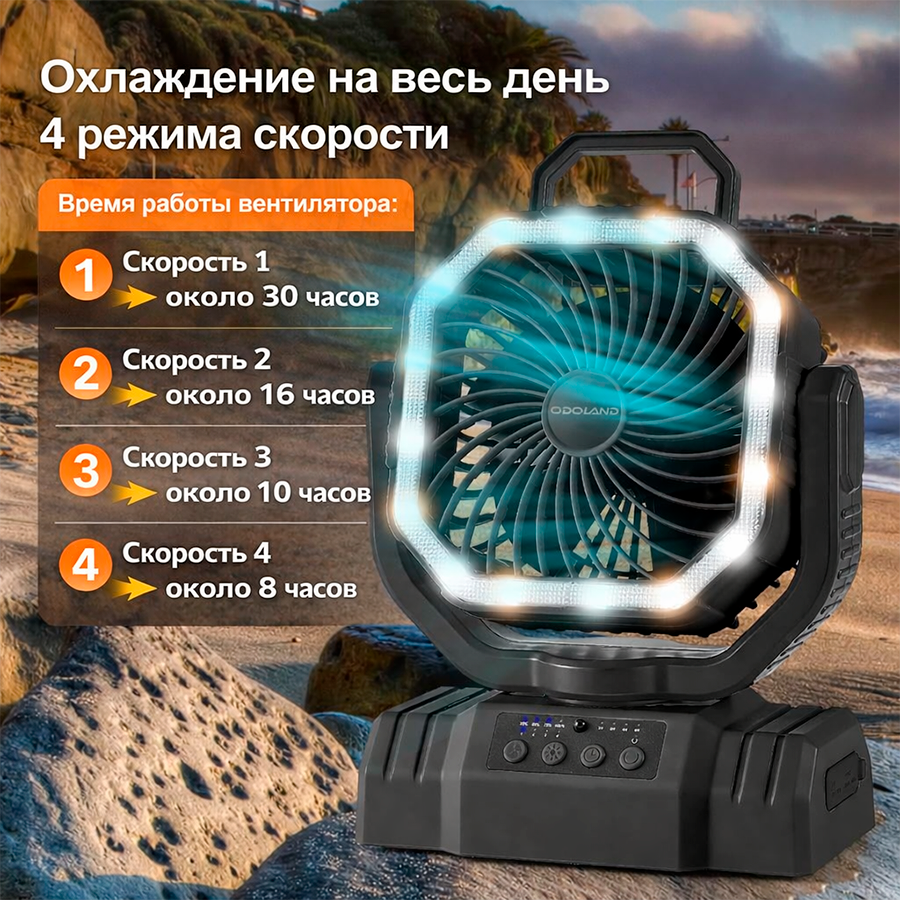 Модель оснащена четырьмя скоростями обдува и работает до 30 часов без подзарядки. Встроенный LED-фонарь с несколькими режимами освещения подходит как для мягкой ночной подсветки, так и для активного использования на улице. Автоматическое вращение и регулируемый угол наклона обеспечивают равномерное распределение воздуха.