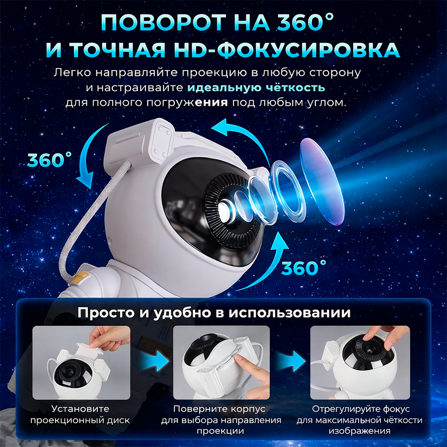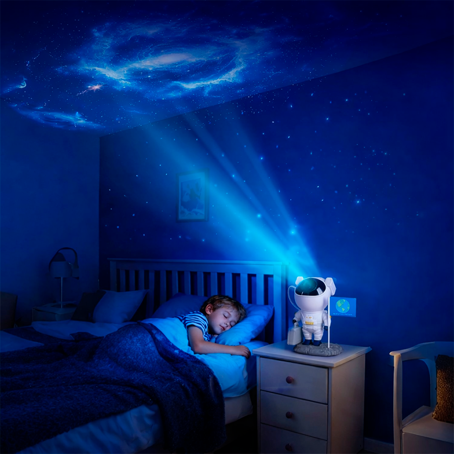 Проектор-астронавт с Bluetooth-колонкой помогает создать расслабляющее пространство для отдыха, сна или вечернего досуга. Устройство проецирует космические сюжеты на стены и потолок, а поворотная голова астронавта позволяет легко менять угол проекции и адаптировать эффект под помещение.
