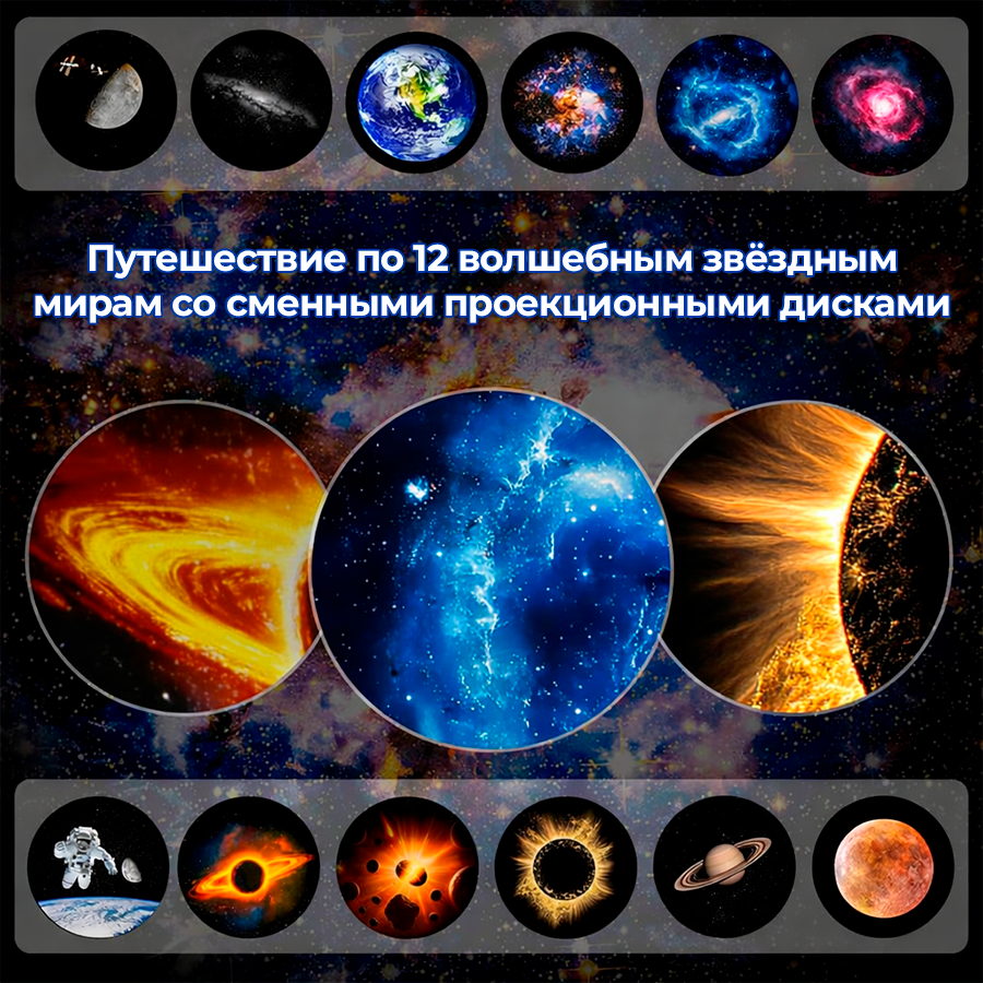 Модель объединяет сразу несколько функций: 12 сменных проекций, Bluetooth 5.0 для воспроизведения музыки и аудио, белый шум для расслабления, таймер на 30 или 60 минут и пульт для удобного управления. Проектор подходит для спальни, детской, домашнего кинотеатра или праздничного декора.