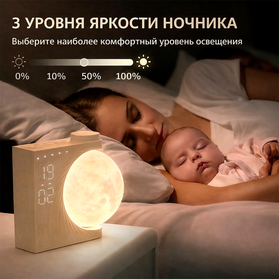 Умный будильник «Рассвет и луна» с подсветкой — это современное устройство, которое помогает мягко просыпаться и создавать комфортную атмосферу перед сном. Функция имитации рассвета постепенно увеличивает яркость света, подготавливая организм к пробуждению без резких звуков и стресса.